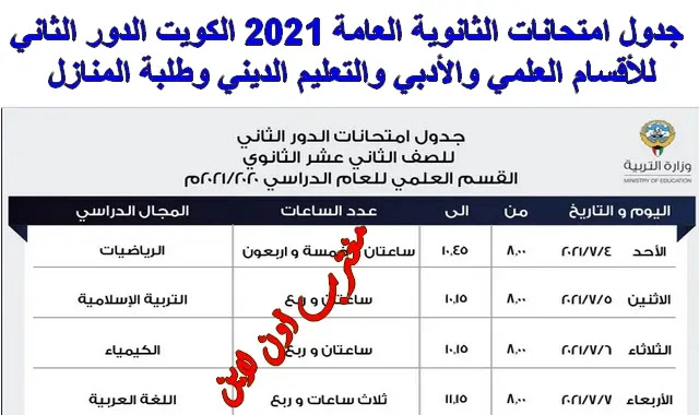 جدول امتحانات الثانوية العامة 2021 الكويت الدور الثاني للأقسام العلمي والأدبي والتعليم الديني وطلبة المنازل