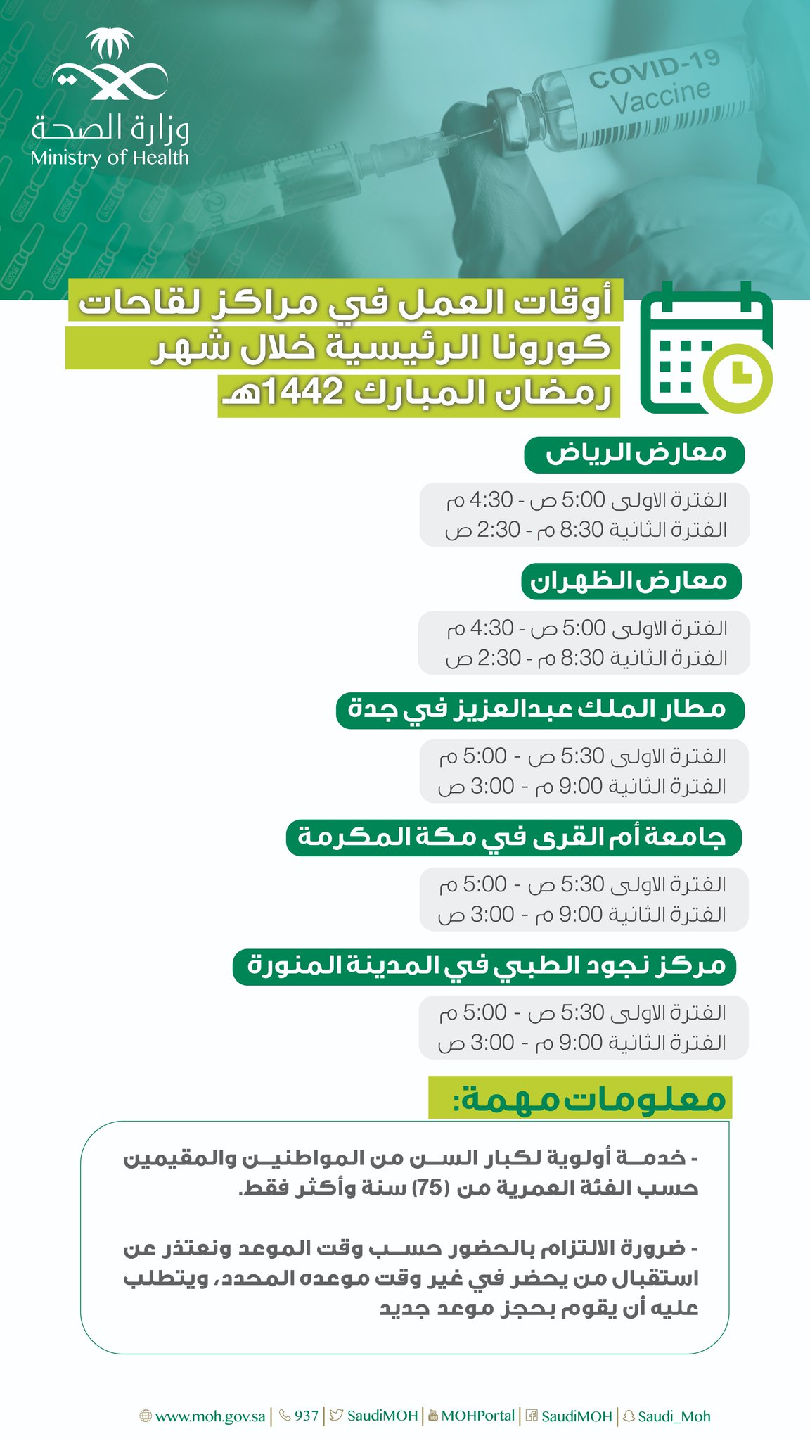 وزارة الصحة والسكان المصرية يمكنك التوجه إلى مراكز تلقي لقاح فيروس كورونا في شهر رمضان من الساعة ٩ صباح ا إلى ١٠ مساء لتلقي اللقاح والوقاية من الإصابة بالفيروس وخاصة كبار السن وأصحاب