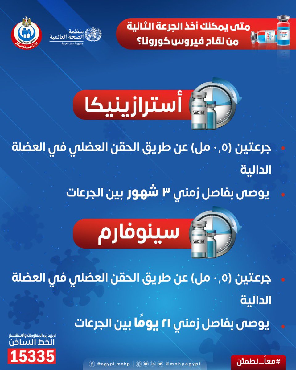 وزارة الصحة والسكان المصرية on twitter متى يمكنك أخذ الجرعة الثانية من لقاح فيروس كورونا كوفيد ١٩ يمكنك التسجيل وحجز لقاح فيروس كورونا من خلال الموقع الإلكتروني https t co uhgl2nvhgq ولمزيد من الاستفسار يرجى الاتصال بالخط