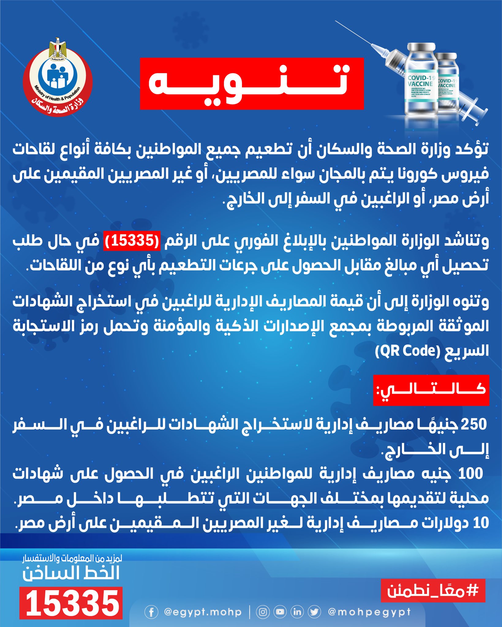 وزارة الصحة والسكان المصرية on twitter تؤكد وزارة الصحة والسكان أن تطعيم جميع المواطنين بكافة أنواع لقاحات فيروس كورونا يتم بالمجان سواء للمصريين أو غير المصريين المقيمين على أرض مصر أو الراغبين